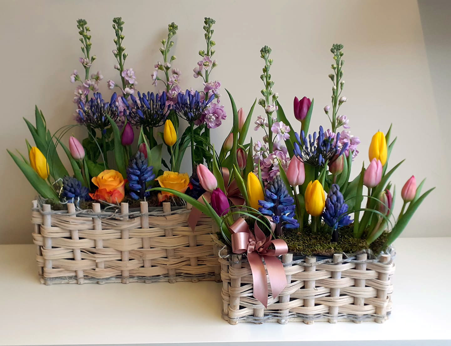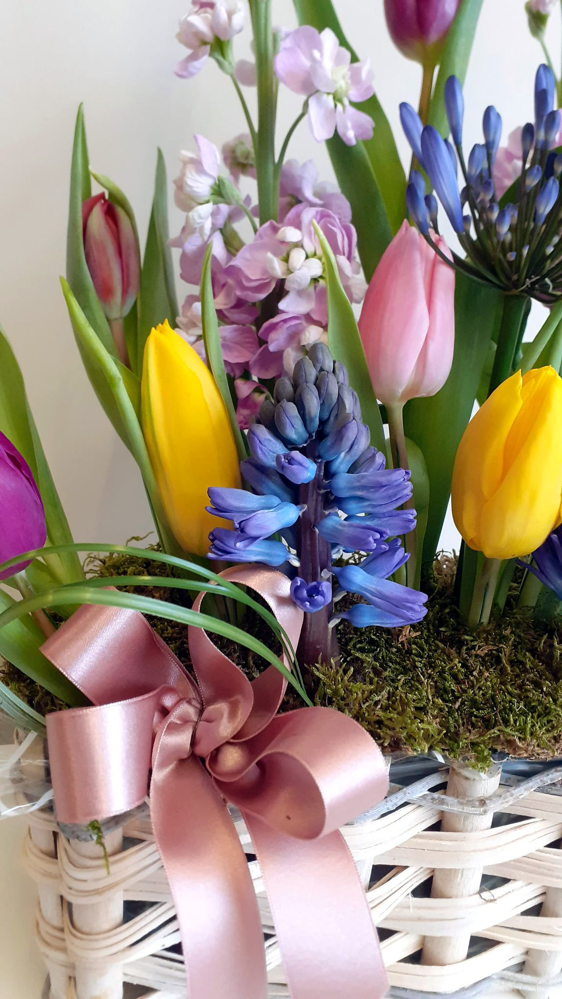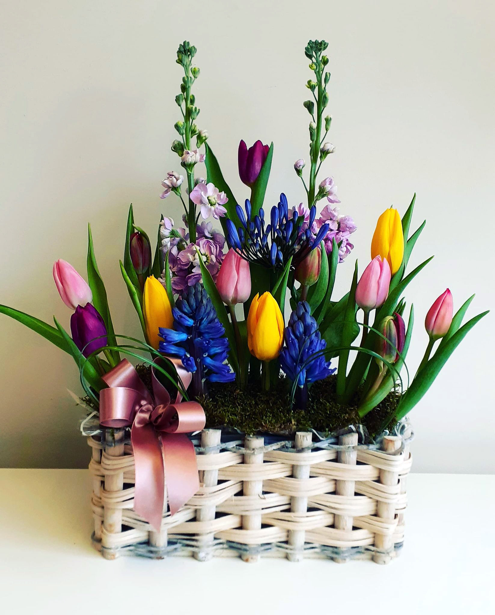 A fresh cut flower indoor window box arrangement, featuring tulips, hyacinth, agapanthus, matthiola, and beargrass. Available in small, medium, and large, priced at £35, £45, and £55.