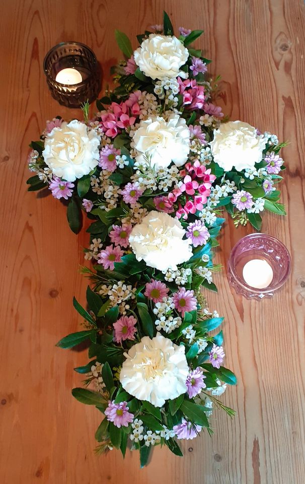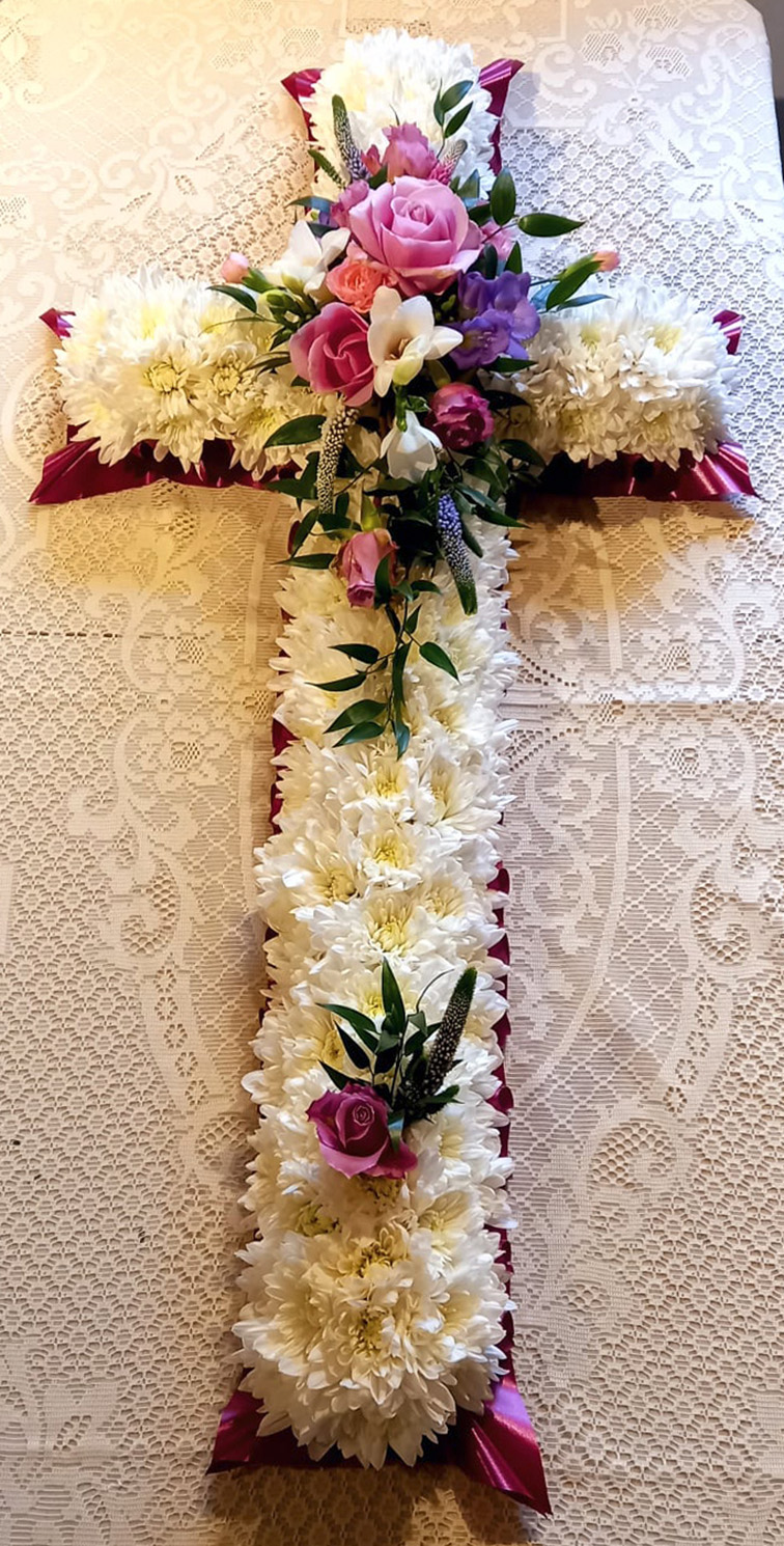 Classic memorial fresh floral crosses. We pride ourselves on our beautiful and bespoke memorial tributes – great care and attention to detail goes into each and every one. Please get in touch to discuss your personal requirements.