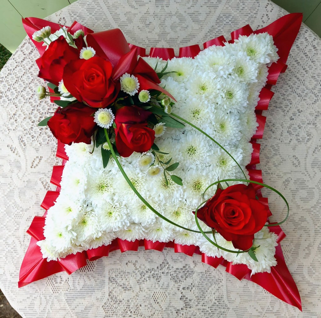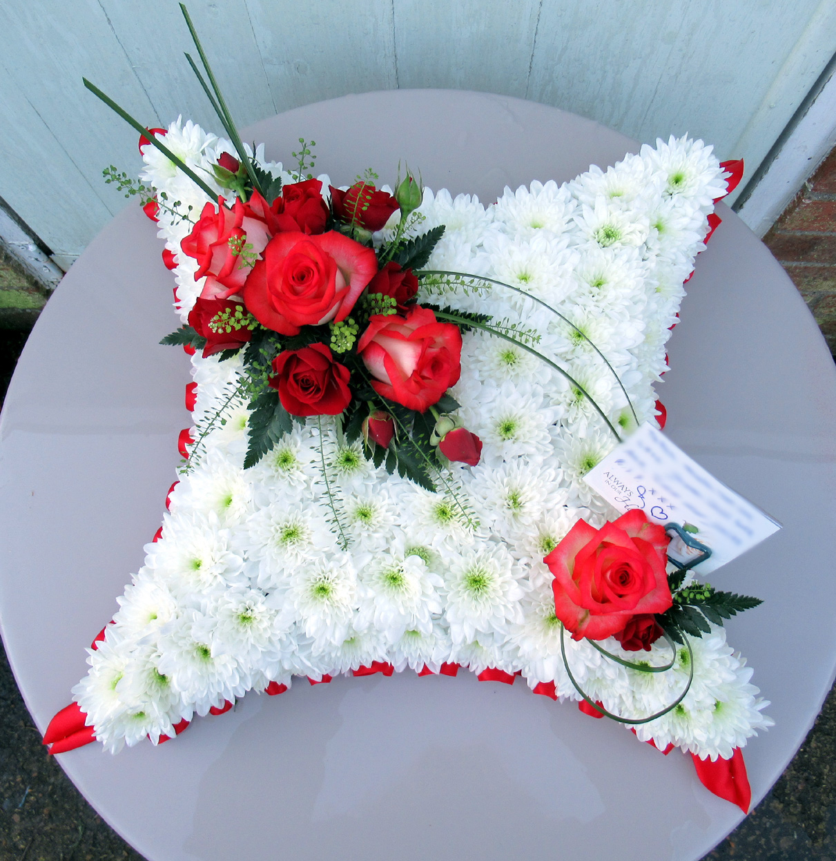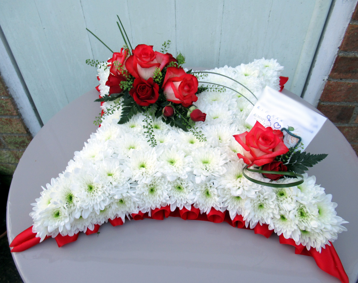 A 15″ based cushion of chrysanthemums with a spray of roses and red ribbon edging.