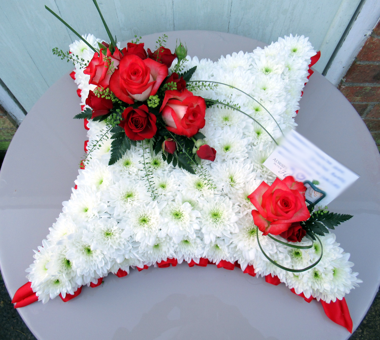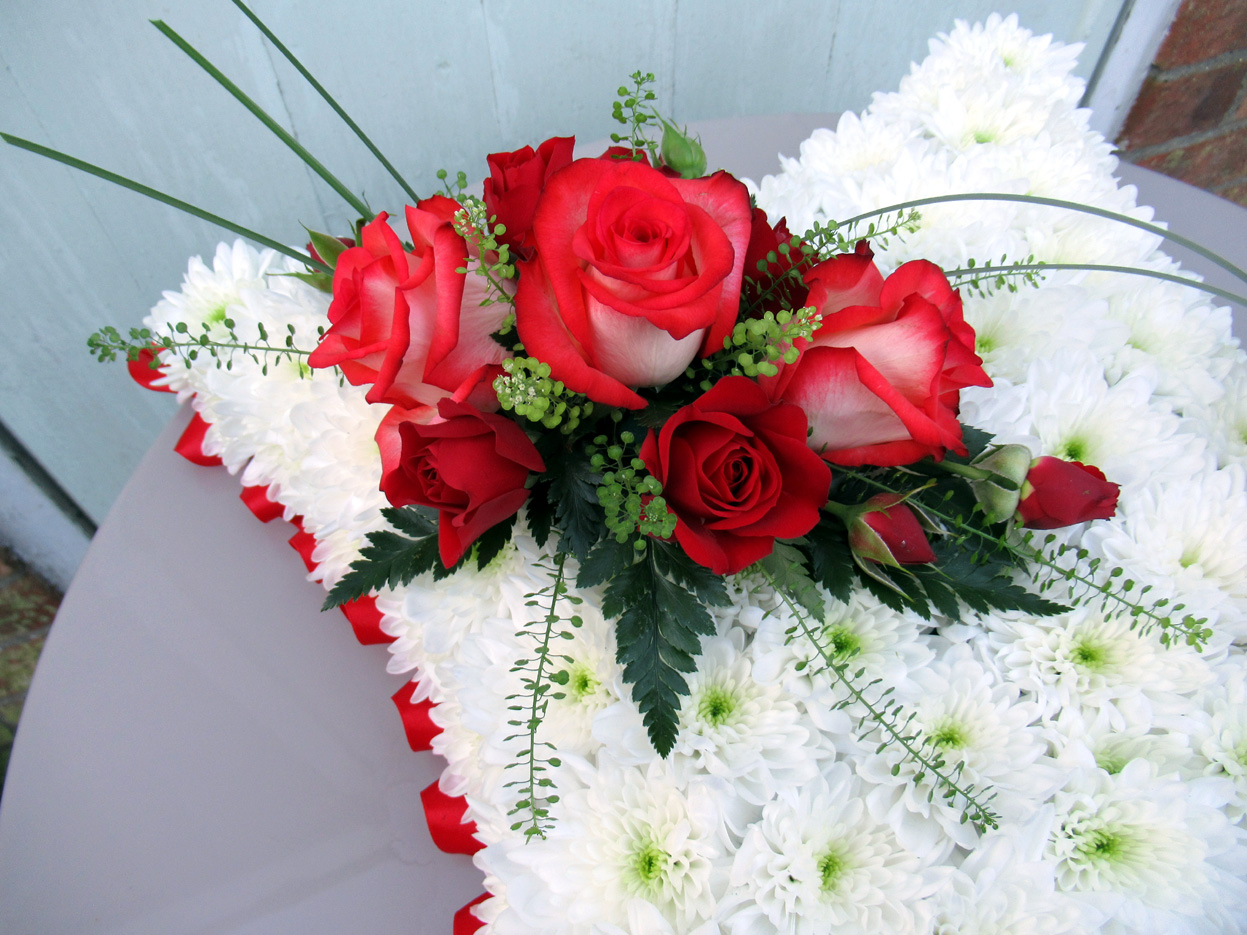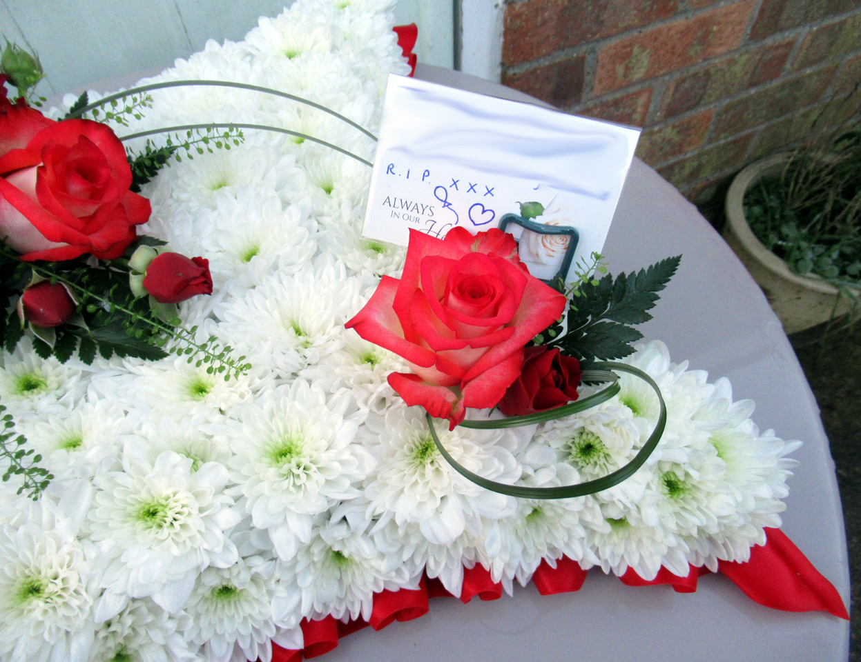 A 15″ based cushion of chrysanthemums with a spray of roses and red ribbon edging.