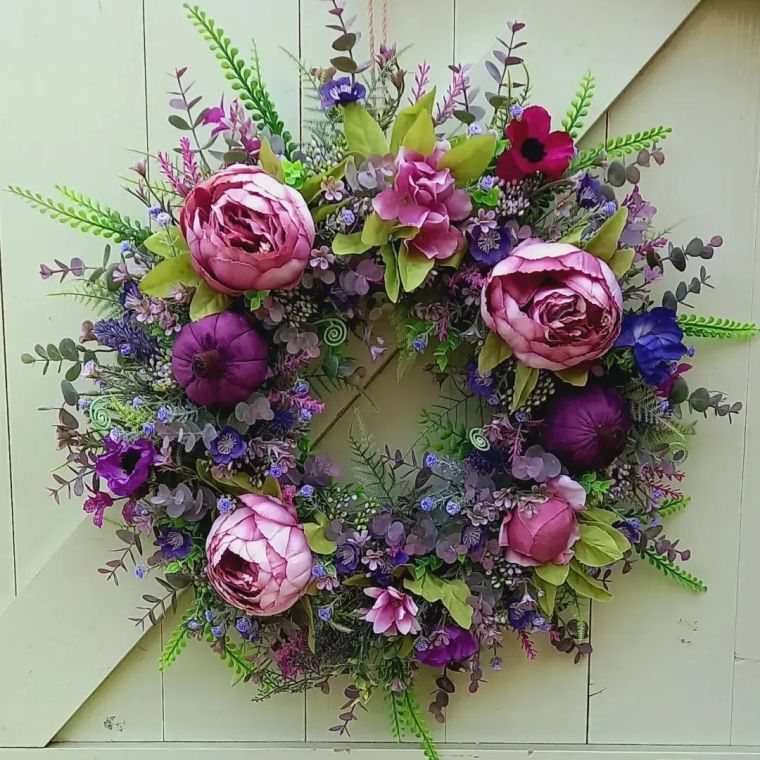 Each wreath is unique, and constructed by hand in our workshop, using the best artificial flowers and greenery, and dried and silk elements, on a professional wreath ring, with each item individually wired and guttered.