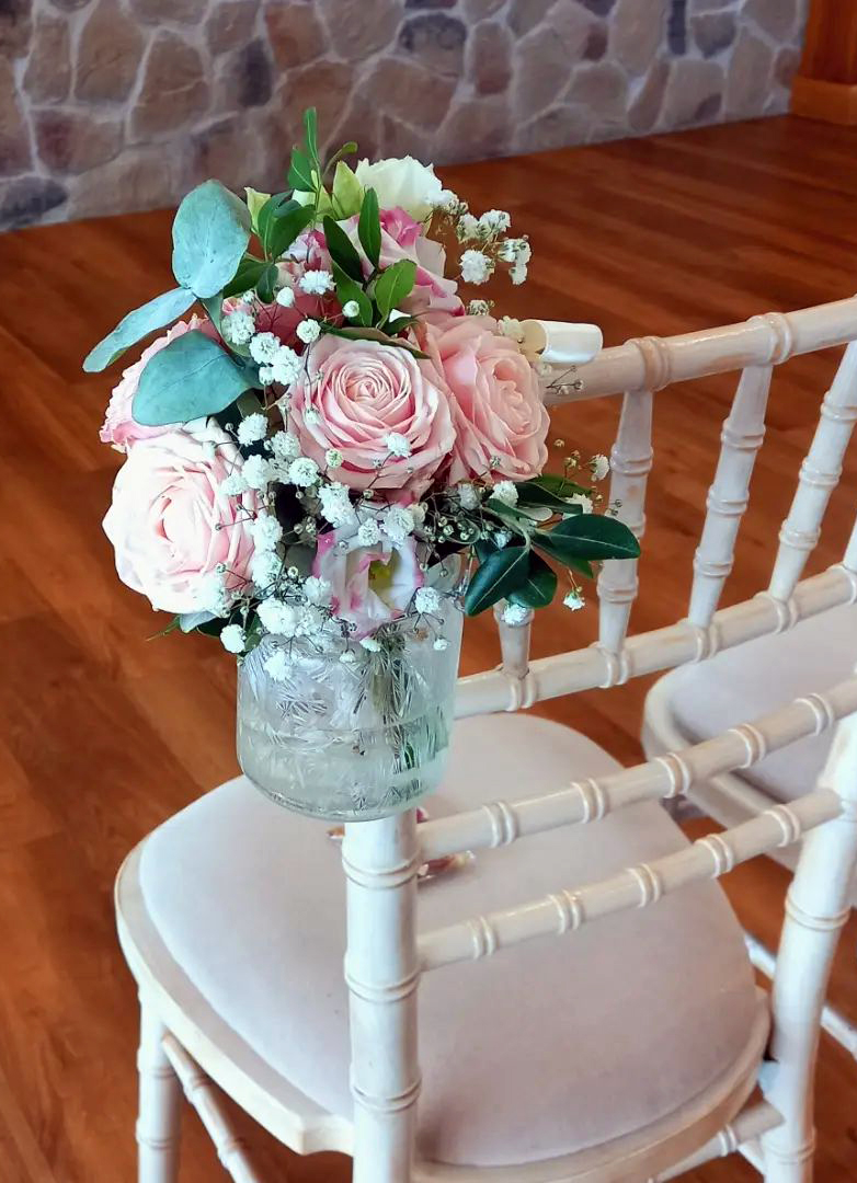 Jar arrangements, including antique pink roses, gypsophila, and eucalyptus, hanging from the chairs down the aisle at Bawburgh Golf Club.