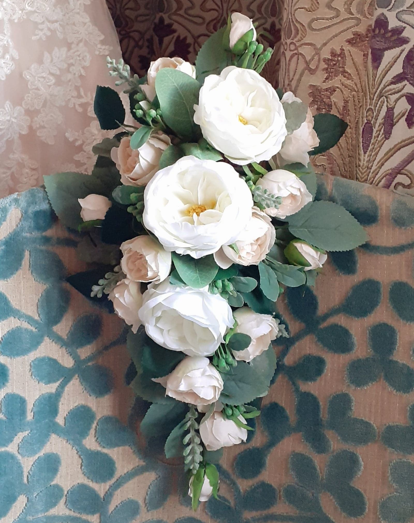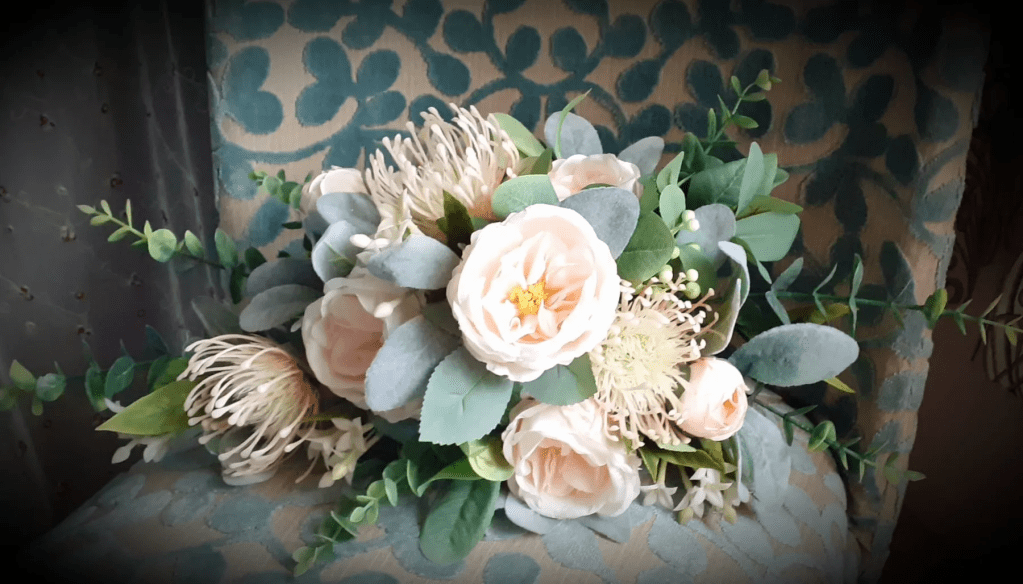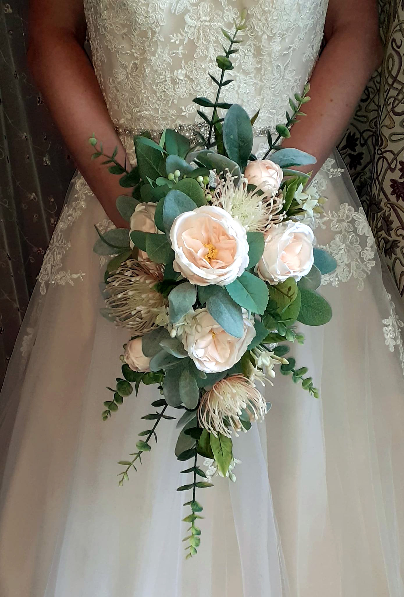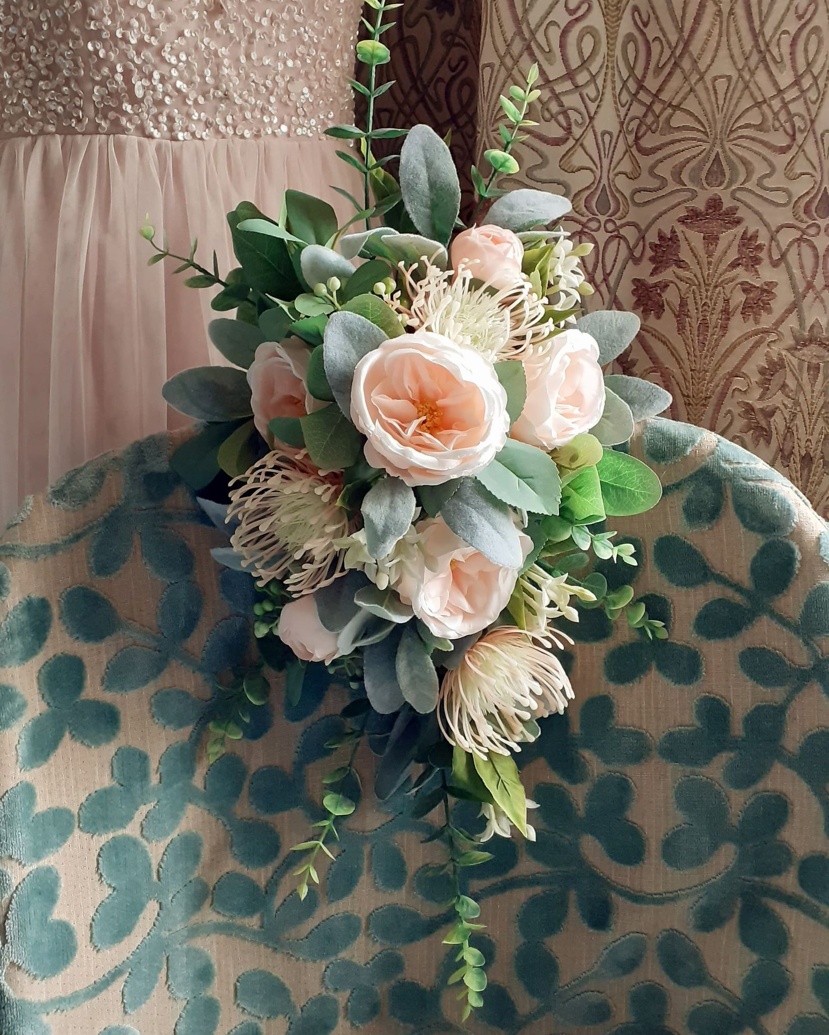 Joanni ~ A modern twist on the traditional shower bouquet, featuring vintage blush roses and leucospermum, with eucalyptus to give shape and texture. Made from silk flowers – using traditional floristry techniques, each flower and piece of foliage has been individually wired, greened, and assembled by hand.