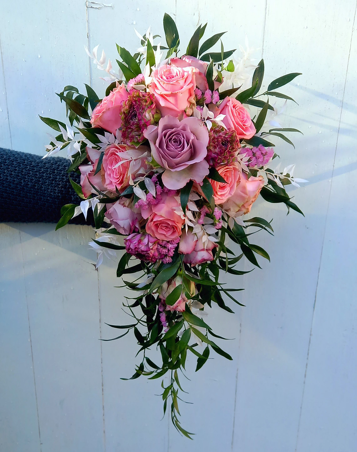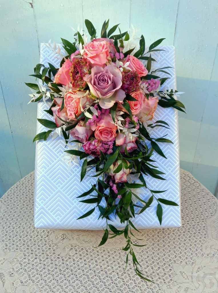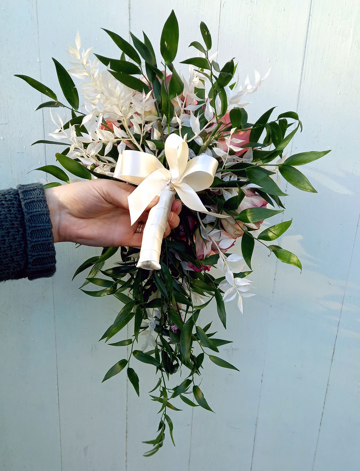 Joanni ~ A modern twist on the traditional shower bouquet, featuring vintage blush roses and leucospermum, with eucalyptus to give shape and texture. Made from silk flowers – using traditional floristry techniques, each flower and piece of foliage has been individually wired, greened, and assembled by hand.
