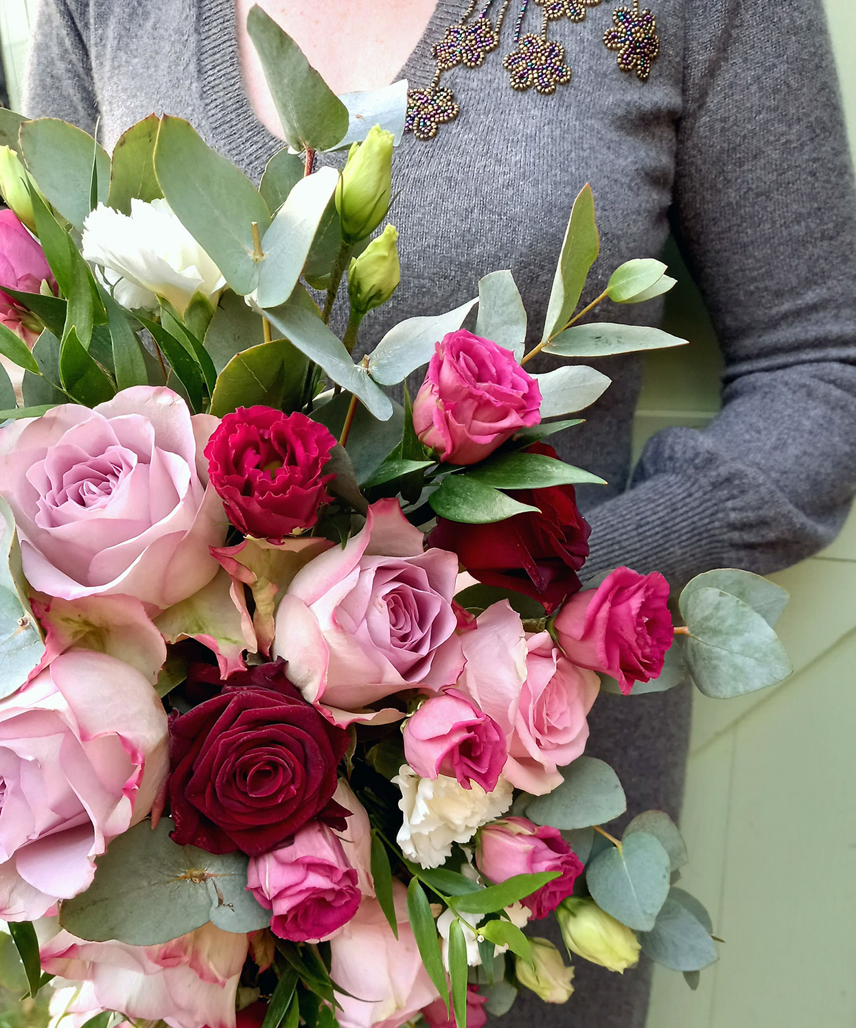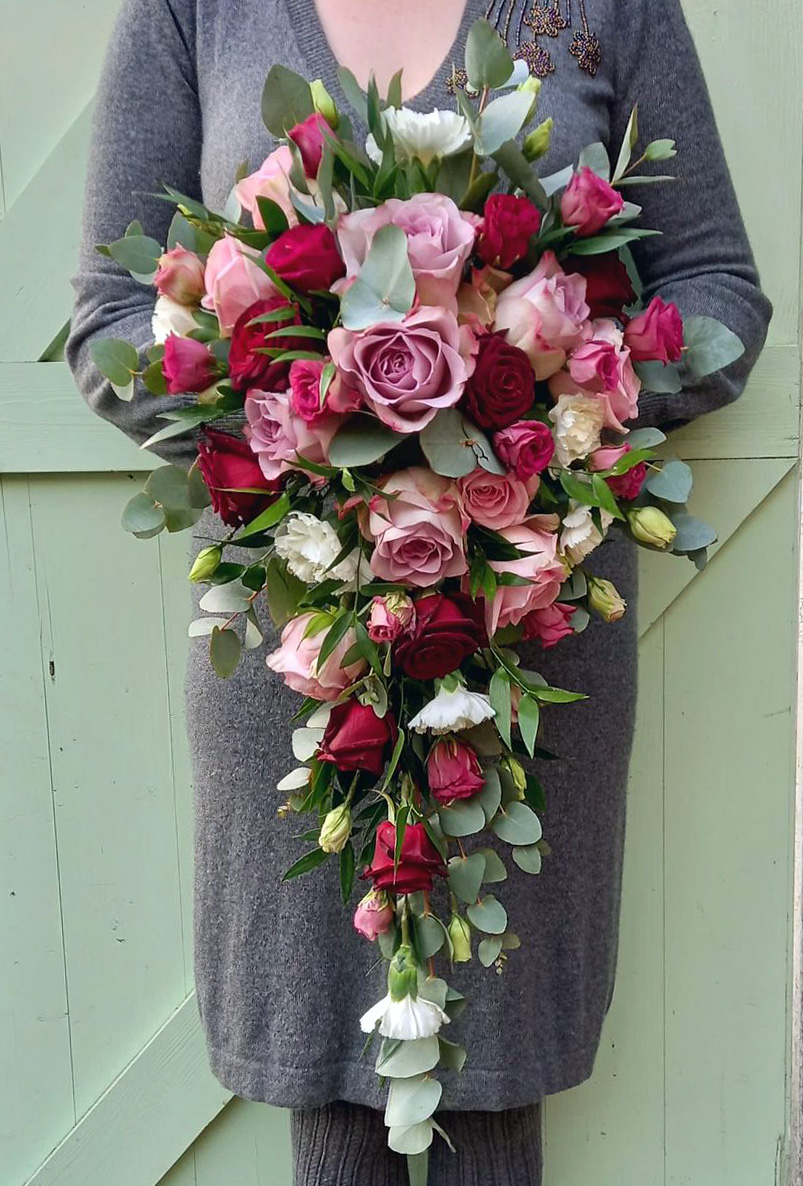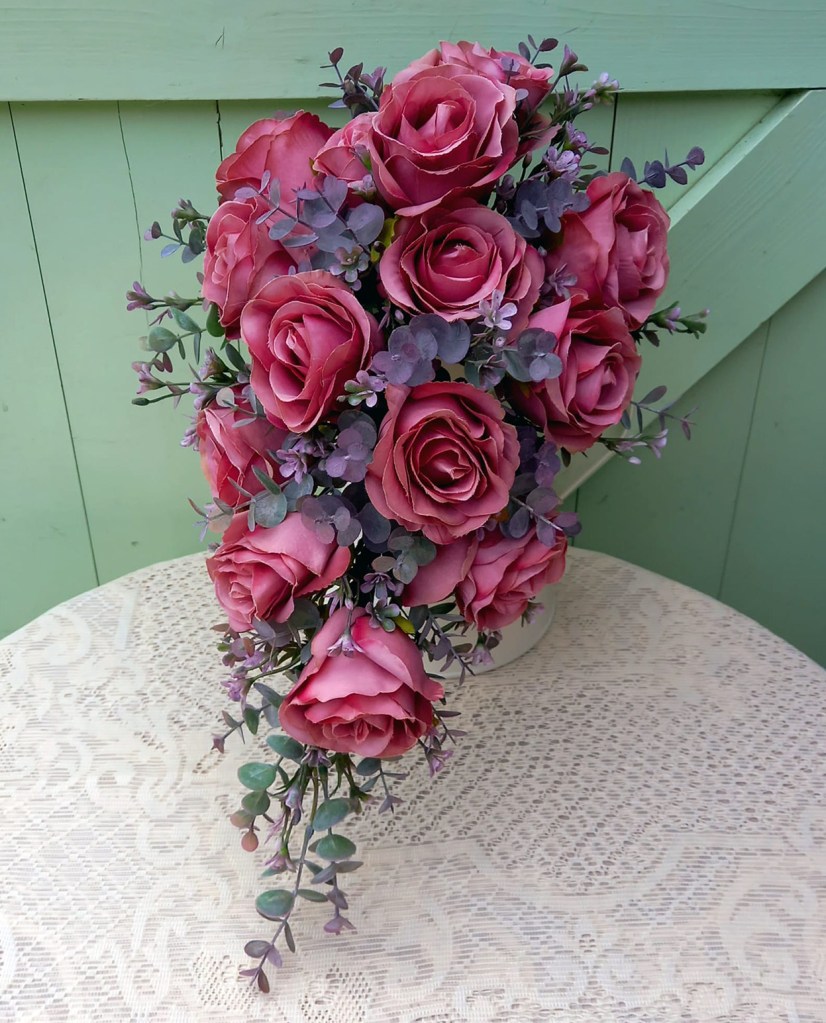 Artificial all rose and eucalyptus shower bouquet. Simple but stylish, available in a range of colours, wired in the traditional way. Just £65. Matching accessories and mail order available.