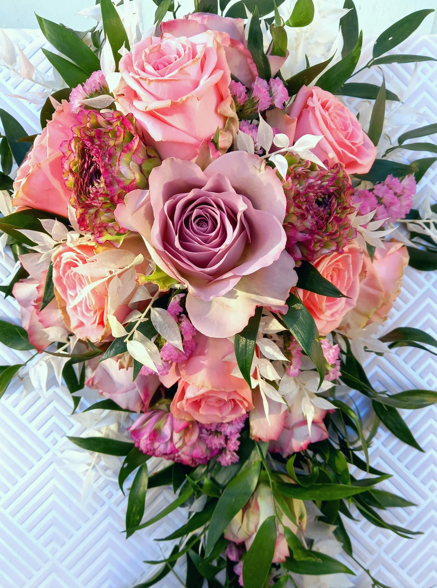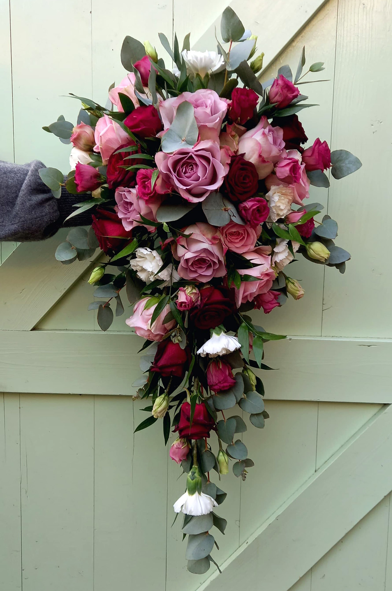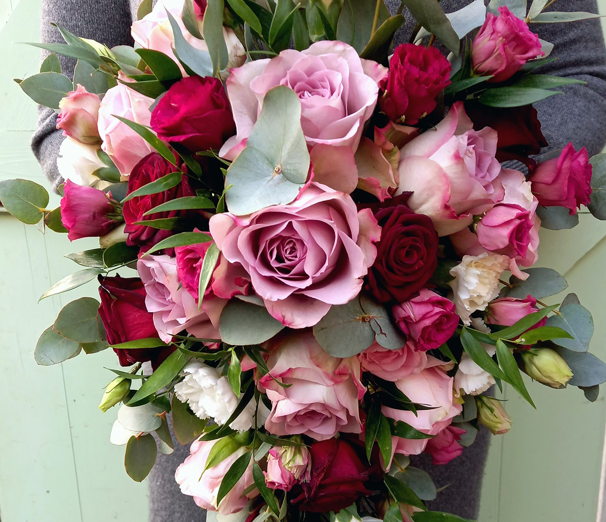 Shannon ~ A shower bouquet of burgundy, blush pink, and dusky purple roses, with white carnations and gypsophila.