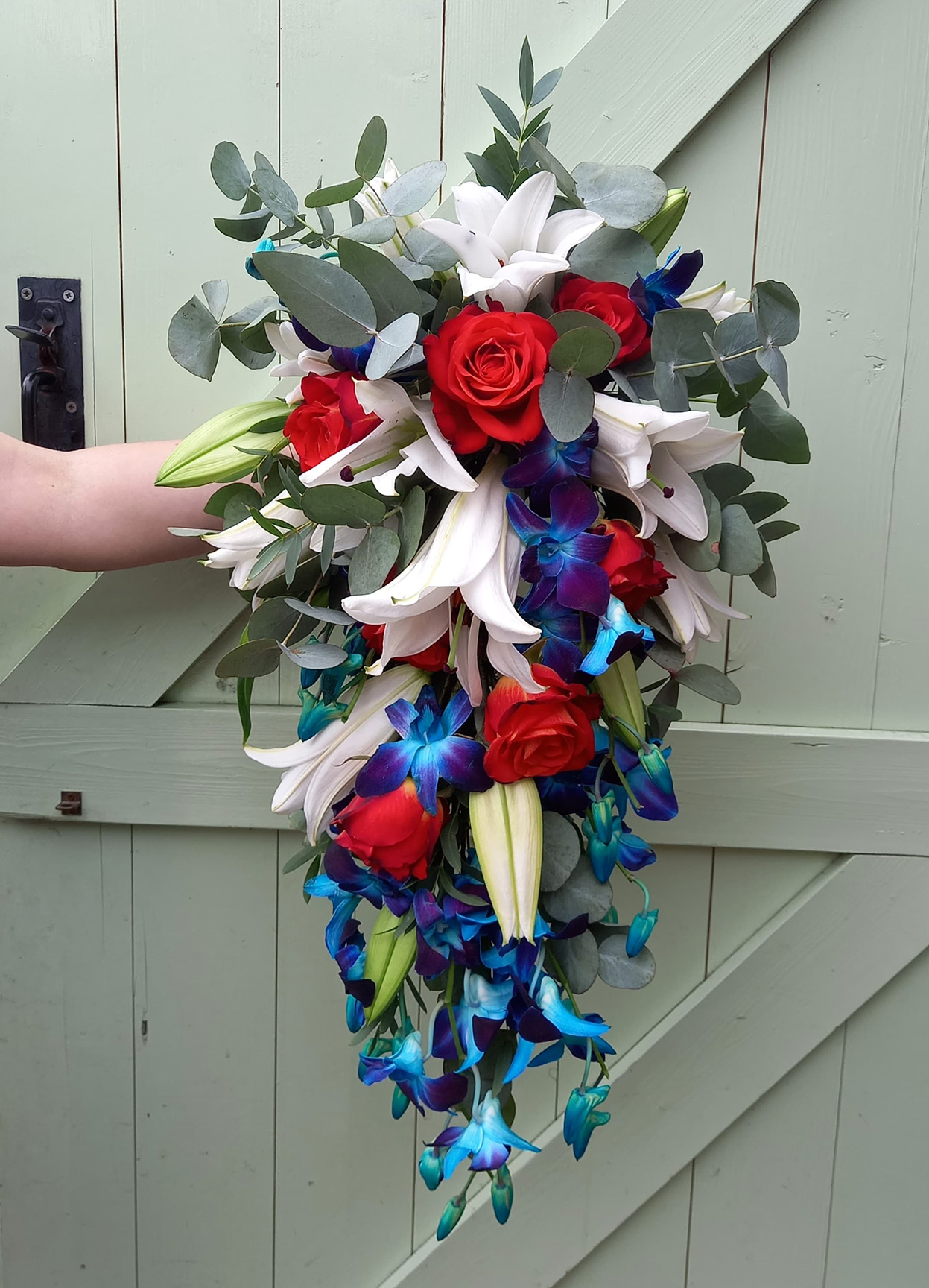 Vix ~ A fun, bold and dazzling shower bouquet of white lilies, red roses, eucalyptus, and blue dendrobium orchids.
