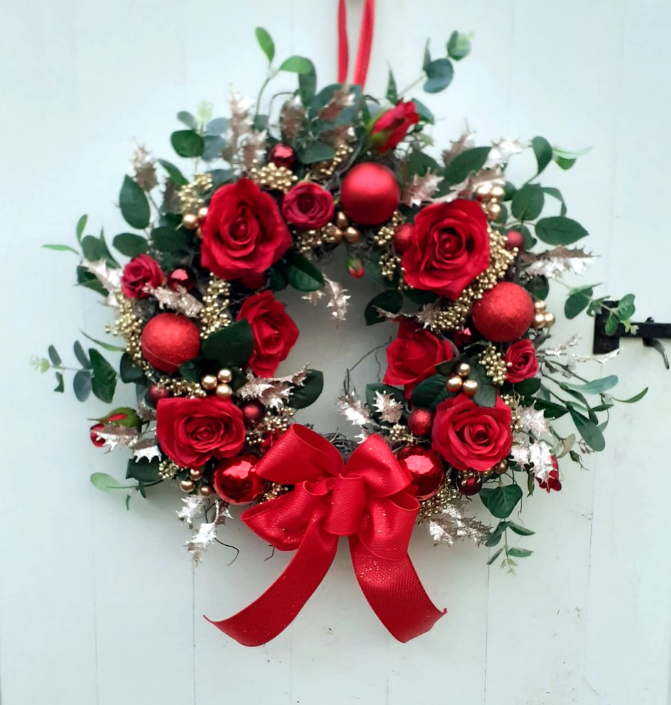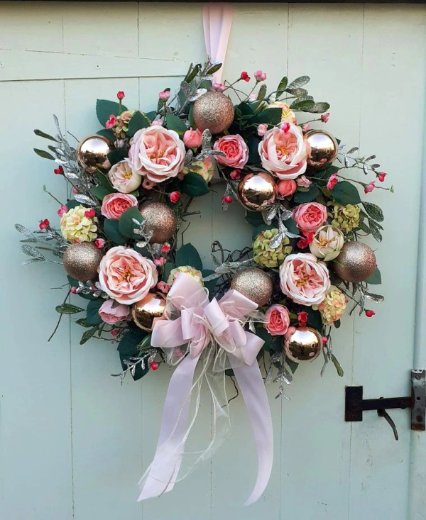 Luxury festive wreath with baubles, and artificial roses, holly and greenery