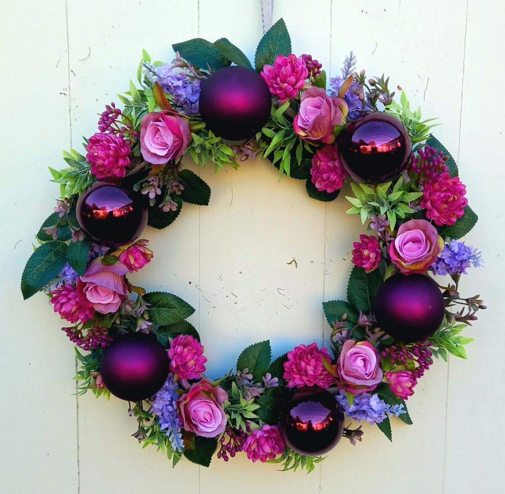 Luxury festive wreath with baubles, and artificial flowers and greenery